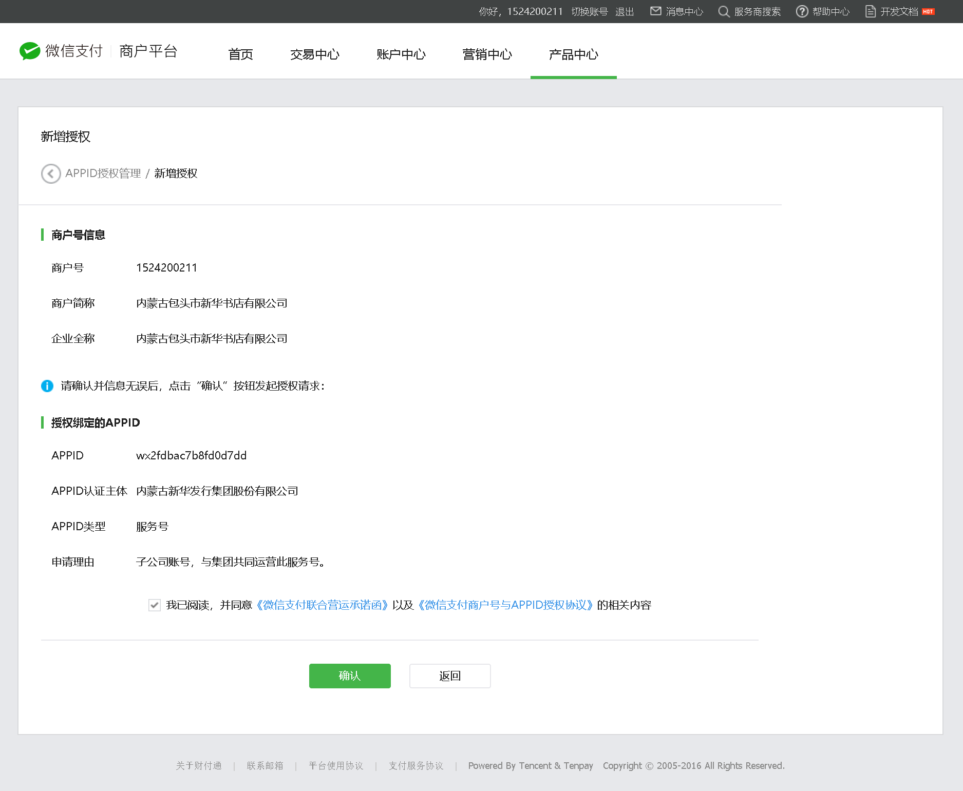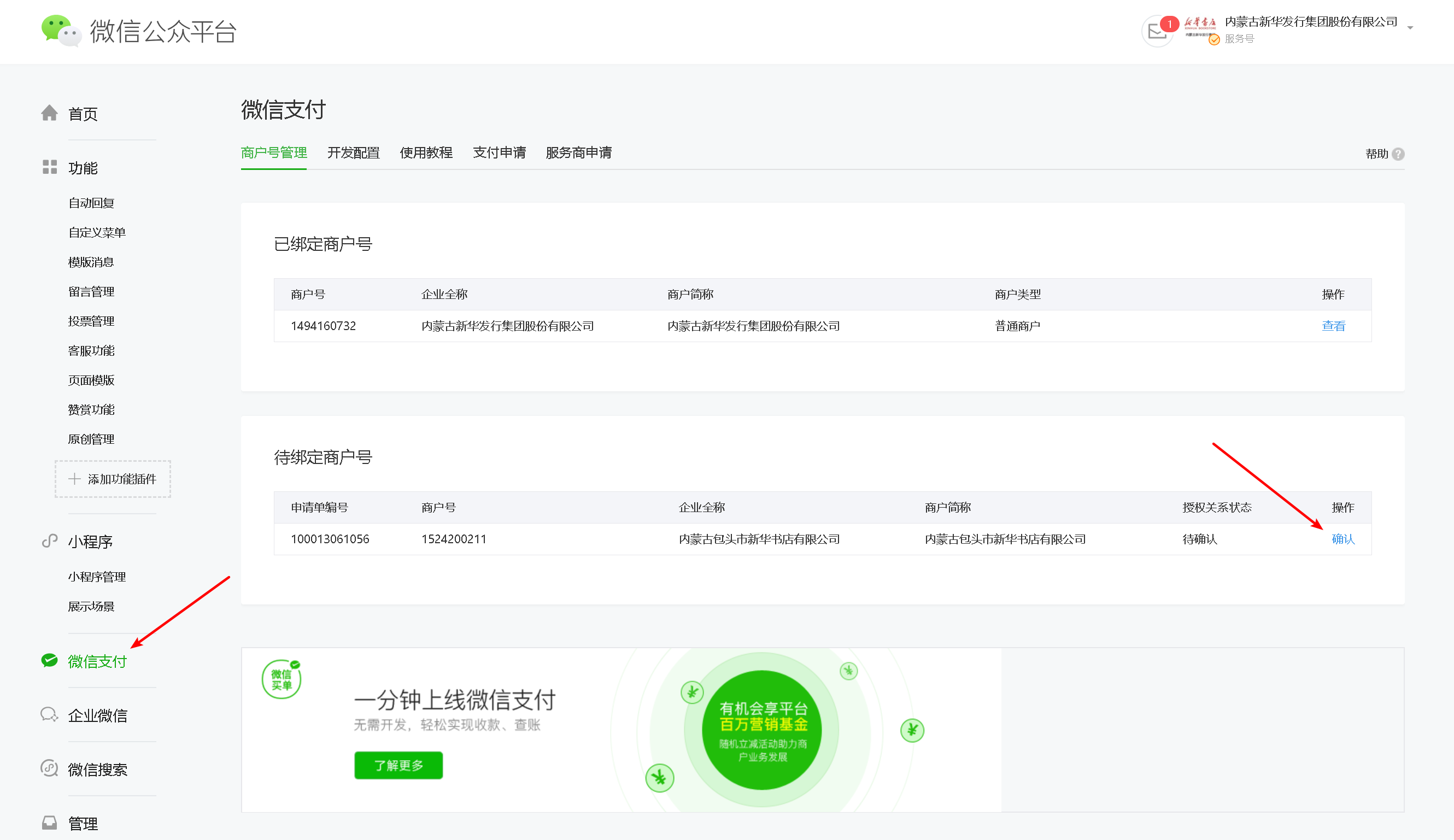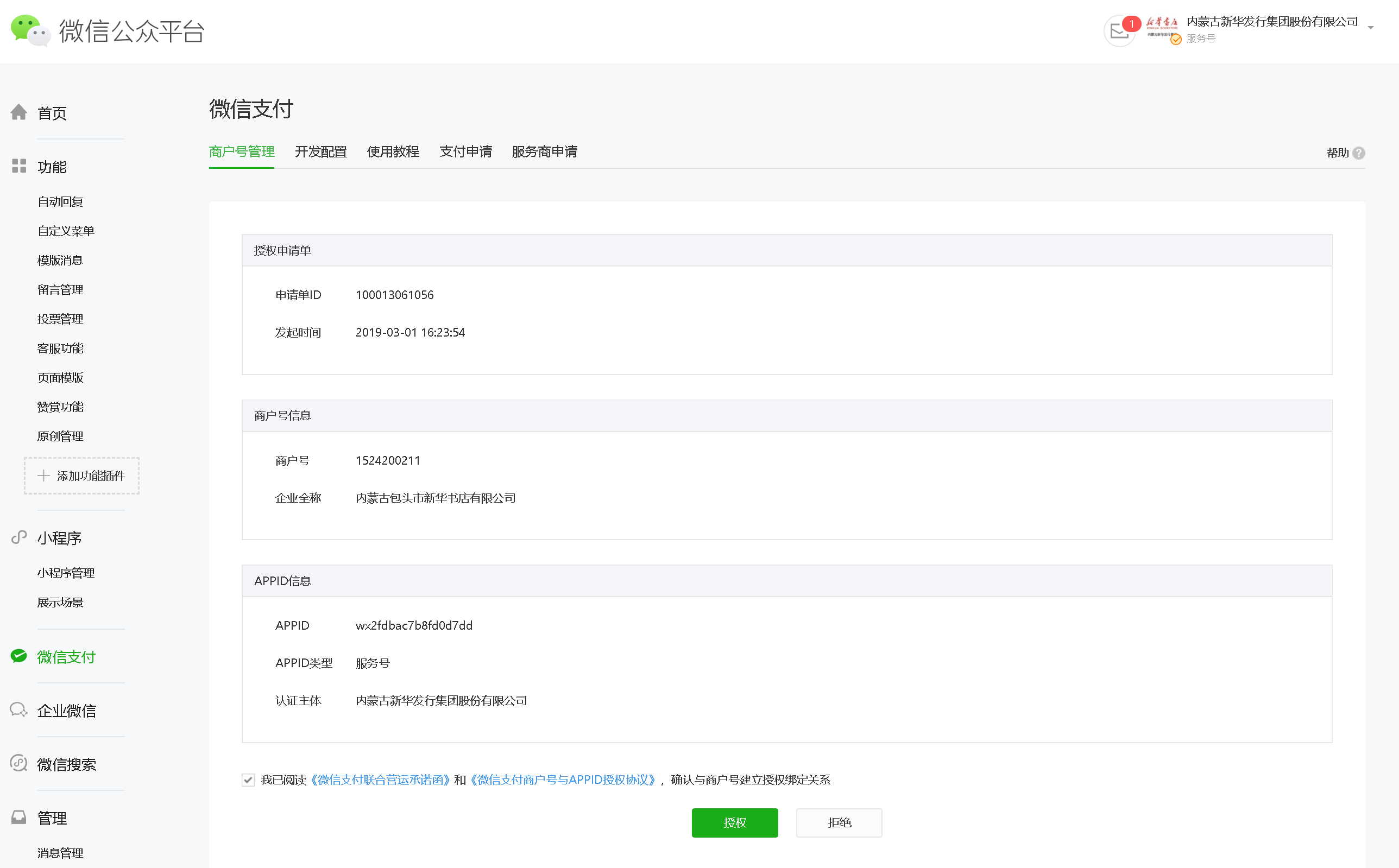 4、支付商户号业务范围与公众号业务范围需一致(例如:公众号业务范围是餐饮,则申请联合运营的商户号业务范围也必须为餐饮)