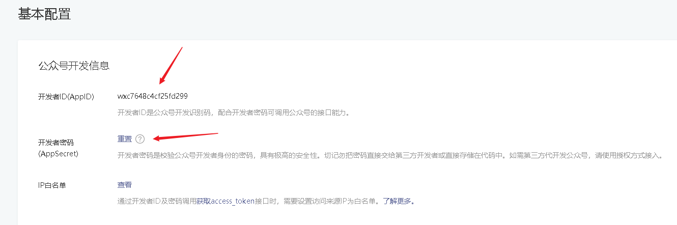 进入公众号“开发”,“基本配置”菜单,获取公众号开发者ID(AppID)和开发者密码(AppSeret)