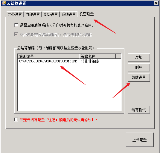进入“机密设置”,选中云结算策略,再点击“参数设置”