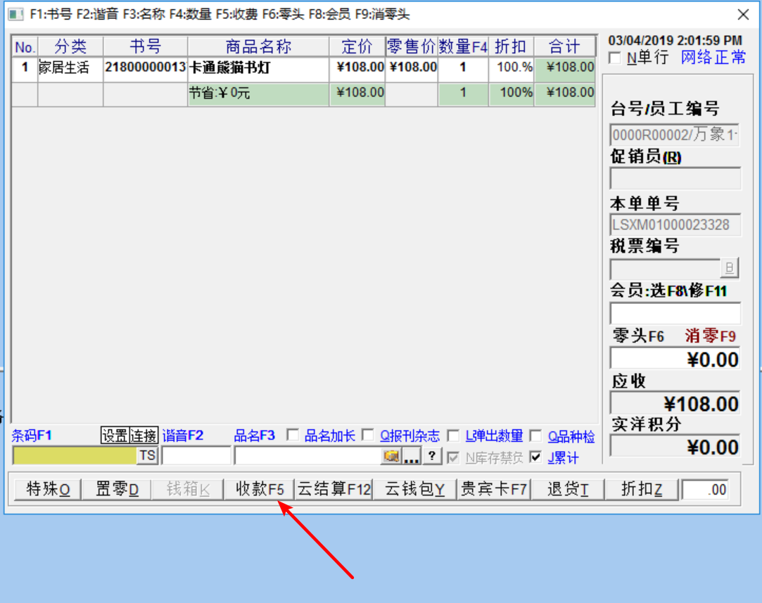 1、在POS零售界面中,选择F5收款,进入组合收款模式
