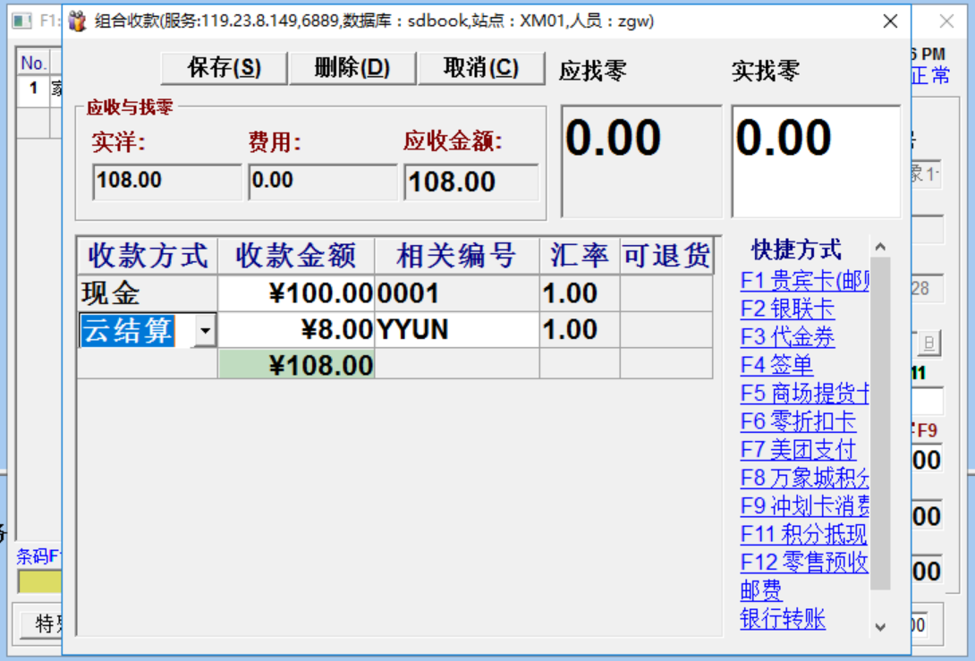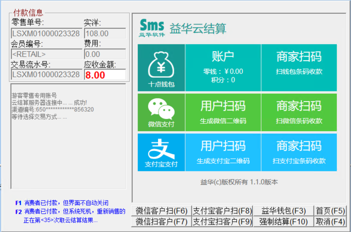 如上图所示,顾客购买108元的商品,支付100元现金,剩余8元使用手机付款,则录入现金100元,云结算8元,然后点击保存,系统自动打开云结算收款窗体。