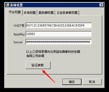 点击菜单“系统设置”,“益华云平台维护”,“新增平台”,填入益华分配的YHDT号、AppKey、AppSecret,然后点击参数验证,建立云端连接。