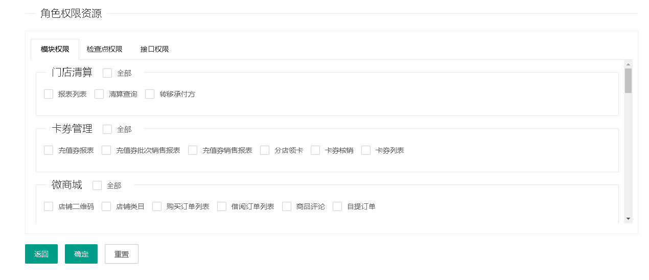 目录 搜索 益华云开放平台升级日志接入指南全局标准输出格式商家配置教程公众号配置教程1、创建顾客入口菜单2、设置公众号域名3、设置公众号IP白名单4、上传公众号配置云用户&云结算API文档(开发专用)修改记录基础接口组用户接口组会员登录会员登录(使用密码)会员登录(使用二维码)发起扫码授权登录获取扫码授权登录结果会员注册获取任意会员AccessToken登录后台系统账户接口组获取会员钱包信息调整钱包余额(平台级)获取钱包明细(用户级)积分接口组获取会员线上积分卡券接口组获取会员卡券列表(用户级)获取会员卡券列表(平台级)卡券可用性查询典型场景云结算接入益华云结算接入指南认证相关获取PlatformAccessToken付款接入创建预付款单据获取会员UID获取游客UID打开支付入口获取支付结果获取支付结果(带渠道和优惠信息)退款接入创建预退款单据打开退款入口获取退款结果数据复核获取获取云结算交易列表账户充值创建预充值单据执行充值通用数据结构账户类型对照支付渠道云结算配置配置向导配置云结算微信退款授权公众号异主体进账配置零售POS操作手册使用前设置POS收款卡券核销POS退款组合收款云结算复核本地交易复核渠道交易复核手机收银台操作手册收银员身份绑定运营设置退款授权推荐关注公众号微信支付联合运营云商城产品介绍API文档(开发专用)基础接口组获取站点公共配置交易接口组获取ERP零售交易列表获取ERP交易明细订单价格计算创建订单获取订单列表商品接口组根据条码、名称查询商品根据 GoodsID 查询商品更新商品库存获取ERP商品信息获取ERP库存信息批量获取会员价类目接口组获取商家自定义类目物流接口组店铺接口组获取站点列表获取站点详情评价接口组用户接口组租借接口组获取借阅卡列表获取借阅记录(用户级)ERP接口组向ERP写入订单获取ERP级别信息设备接口组获取设备信息通用数据结构购买类订单数据结构SellerCategory 商家自定义类目Goods 商品基本信息Device 设备信息ERP商品信息订单来源说明TradeType订单类型订单状态云物流产品介绍API文档(开发专用)数据接口组通用数据传输云梯产品介绍插件使用益华ERP中金ERP云备份商家后台管理系统系统设置权限管理角色维护角色授权用户授权门店管理新增门店商品类目管理商品管理商品上新教程设置上新站点和库房商品标记设置商品上新参数卡券管理卡券创建折扣券代金券礼品券通用属性说明卡券投放卡券核销卡券兑换营销活动管理功能简介录入营销活动参与营销活动营销活动管理会员体系设置通用会员级别借阅会员级别云钱包管理办理充值支付对账点餐模式设置设置门店座位布局设置点餐商品分类微信消息推送设置云采购文轩采购对接(ERP集成)用户标签标签分组管理用户标签管理标签使用场景微商城访问统计店中店分销模式代理商分润计算常见问题处理为什么商城中没有显示商品?益华云营销策略大全益华云电子卡券大全通用数据结构通用查询条件 暂无相关搜索结果! 本文档使用 MinDoc 发布 角色授权 在具体的分组上,创建角色: 点击“角色权限管理”,对角色进行授权: 勾选上所需要的权限,注意需将模块权限和接口权限一起授权: 完成角色授权。文档更新时间: 2019-04-18 22:23 作者:张国伟
