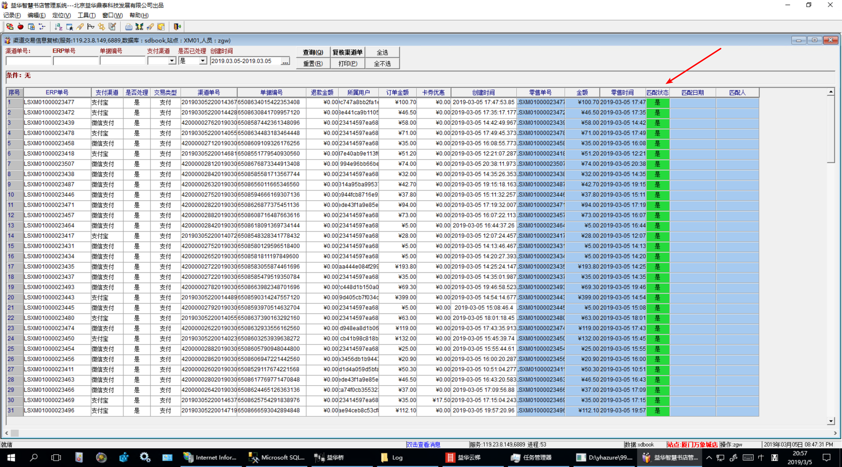 目录 搜索 益华云开放平台升级日志接入指南全局标准输出格式商家配置教程公众号配置教程1、创建顾客入口菜单2、设置公众号域名3、设置公众号IP白名单4、上传公众号配置云用户&云结算API文档(开发专用)修改记录基础接口组用户接口组会员登录会员登录(使用密码)会员登录(使用二维码)发起扫码授权登录获取扫码授权登录结果会员注册获取任意会员AccessToken登录后台系统账户接口组获取会员钱包信息调整钱包余额(平台级)获取钱包明细(用户级)积分接口组获取会员线上积分卡券接口组获取会员卡券列表(用户级)获取会员卡券列表(平台级)卡券可用性查询典型场景云结算接入益华云结算接入指南认证相关获取PlatformAccessToken付款接入创建预付款单据获取会员UID获取游客UID打开支付入口获取支付结果获取支付结果(带渠道和优惠信息)退款接入创建预退款单据打开退款入口获取退款结果数据复核获取获取云结算交易列表账户充值创建预充值单据执行充值通用数据结构账户类型对照支付渠道云结算配置配置向导配置云结算微信退款授权公众号异主体进账配置零售POS操作手册使用前设置POS收款卡券核销POS退款组合收款云结算复核本地交易复核渠道交易复核手机收银台操作手册收银员身份绑定运营设置退款授权推荐关注公众号微信支付联合运营云商城产品介绍API文档(开发专用)基础接口组获取站点公共配置交易接口组获取ERP零售交易列表获取ERP交易明细订单价格计算创建订单获取订单列表商品接口组根据条码、名称查询商品根据 GoodsID 查询商品更新商品库存获取ERP商品信息获取ERP库存信息批量获取会员价类目接口组获取商家自定义类目物流接口组店铺接口组获取站点列表获取站点详情评价接口组用户接口组租借接口组获取借阅卡列表获取借阅记录(用户级)ERP接口组向ERP写入订单获取ERP级别信息设备接口组获取设备信息通用数据结构购买类订单数据结构SellerCategory 商家自定义类目Goods 商品基本信息Device 设备信息ERP商品信息订单来源说明TradeType订单类型订单状态云物流产品介绍API文档(开发专用)数据接口组通用数据传输云梯产品介绍插件使用益华ERP中金ERP云备份商家后台管理系统系统设置权限管理角色维护角色授权用户授权门店管理新增门店商品类目管理商品管理商品上新教程设置上新站点和库房商品标记设置商品上新参数卡券管理卡券创建折扣券代金券礼品券通用属性说明卡券投放卡券核销卡券兑换营销活动管理功能简介录入营销活动参与营销活动营销活动管理会员体系设置通用会员级别借阅会员级别云钱包管理办理充值支付对账点餐模式设置设置门店座位布局设置点餐商品分类微信消息推送设置云采购文轩采购对接(ERP集成)用户标签标签分组管理用户标签管理标签使用场景微商城访问统计店中店分销模式代理商分润计算常见问题处理为什么商城中没有显示商品?益华云营销策略大全益华云电子卡券大全通用数据结构通用查询条件 暂无相关搜索结果! 本文档使用 MinDoc 发布 渠道交易复核 1、进入ERP系统,渠道交易复核 2、查询渠道交易情况,找出匹配状态为否的订单 3、对异常小票进行复核和处理,直至所有小票都匹配成功 文档更新时间: 2019-03-05 21:06 作者:张国伟