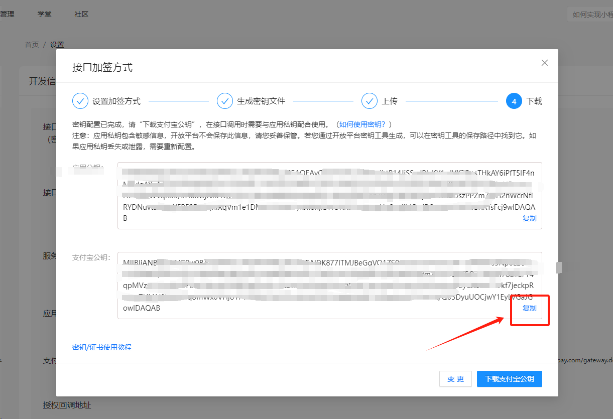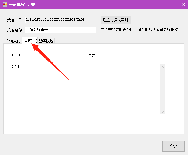 8、一共得到了PID、APPID、支付宝公钥三个参数,现在切换云梯配置至“支付宝”,将这三个参数,正确填入,即完成支付宝收款配置。