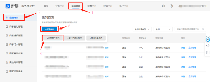 3.找到商家管理——我的商家——代理商家——代单商户签约