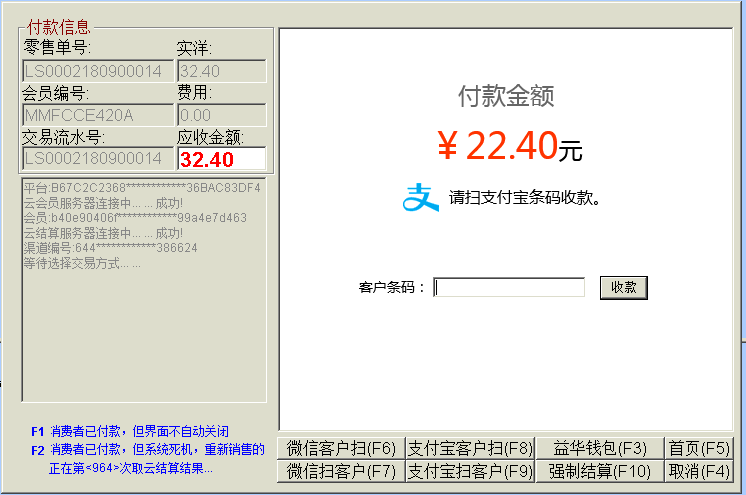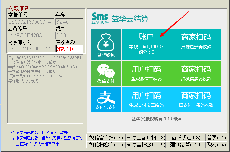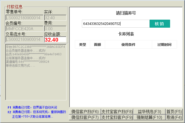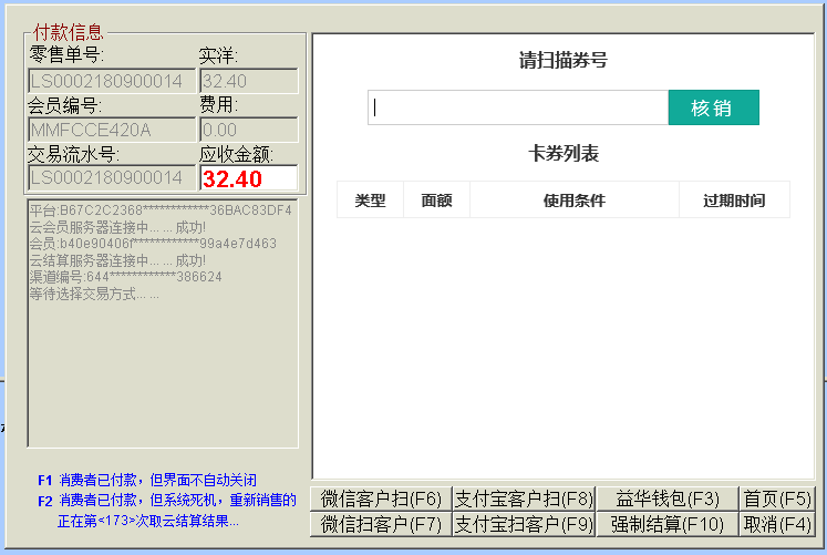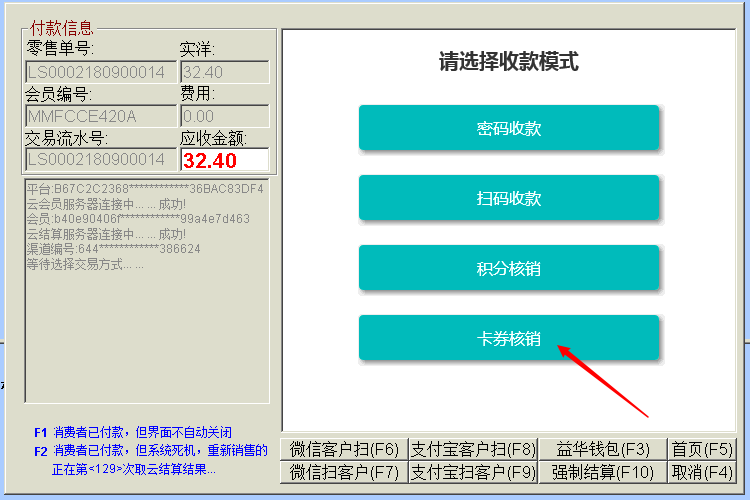 目录 搜索 益华云开放平台升级日志接入指南全局标准输出格式商家配置教程公众号配置教程1、创建顾客入口菜单2、设置公众号域名3、设置公众号IP白名单4、上传公众号配置云用户&云结算API文档(开发专用)修改记录基础接口组用户接口组会员登录会员登录(使用密码)会员登录(使用二维码)发起扫码授权登录获取扫码授权登录结果会员注册获取任意会员AccessToken登录后台系统账户接口组获取会员钱包信息调整钱包余额(平台级)获取钱包明细(用户级)积分接口组获取会员线上积分卡券接口组获取会员卡券列表(用户级)获取会员卡券列表(平台级)卡券可用性查询典型场景云结算接入益华云结算接入指南认证相关获取PlatformAccessToken付款接入创建预付款单据获取会员UID获取游客UID打开支付入口获取支付结果获取支付结果(带渠道和优惠信息)退款接入创建预退款单据打开退款入口获取退款结果数据复核获取获取云结算交易列表账户充值创建预充值单据执行充值通用数据结构账户类型对照支付渠道云结算配置配置向导配置云结算微信退款授权公众号异主体进账配置零售POS操作手册使用前设置POS收款卡券核销POS退款组合收款云结算复核本地交易复核渠道交易复核手机收银台操作手册收银员身份绑定运营设置退款授权推荐关注公众号微信支付联合运营云商城产品介绍API文档(开发专用)基础接口组获取站点公共配置交易接口组获取ERP零售交易列表获取ERP交易明细订单价格计算创建订单获取订单列表商品接口组根据条码、名称查询商品根据 GoodsID 查询商品更新商品库存获取ERP商品信息获取ERP库存信息批量获取会员价类目接口组获取商家自定义类目物流接口组店铺接口组获取站点列表获取站点详情评价接口组用户接口组租借接口组获取借阅卡列表获取借阅记录(用户级)ERP接口组向ERP写入订单获取ERP级别信息设备接口组获取设备信息通用数据结构购买类订单数据结构SellerCategory 商家自定义类目Goods 商品基本信息Device 设备信息ERP商品信息订单来源说明TradeType订单类型订单状态云物流产品介绍API文档(开发专用)数据接口组通用数据传输云梯产品介绍插件使用益华ERP中金ERP云备份商家后台管理系统系统设置权限管理角色维护角色授权用户授权门店管理新增门店商品类目管理商品管理商品上新教程设置上新站点和库房商品标记设置商品上新参数卡券管理卡券创建折扣券代金券礼品券通用属性说明卡券投放卡券核销卡券兑换营销活动管理功能简介录入营销活动参与营销活动营销活动管理会员体系设置通用会员级别借阅会员级别云钱包管理办理充值支付对账点餐模式设置设置门店座位布局设置点餐商品分类微信消息推送设置云采购文轩采购对接(ERP集成)用户标签标签分组管理用户标签管理标签使用场景微商城访问统计店中店分销模式代理商分润计算常见问题处理为什么商城中没有显示商品?益华云营销策略大全益华云电子卡券大全通用数据结构通用查询条件 暂无相关搜索结果! 本文档使用 MinDoc 发布 卡券核销 进入ERP零售收款界面,正常下单,然后进入云结算1、点击钱包“账户” 2、选择“卡券核销” 3、顾客出示卡券 4、扫描卡券条码 扫描卡券条码后,系统自动返回收款收款界面,并且体现卡券优惠 然后继续正常收款流程即可 注意:1、云结算支持多张卡券叠加使用,重复以上卡券核销流程即可。2、卡券核销可以将小票金额降至0元,然后继续收款,系统会跳过支付直接出小票。文档更新时间: 2019-03-08 13:34 作者:张国伟