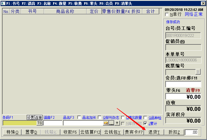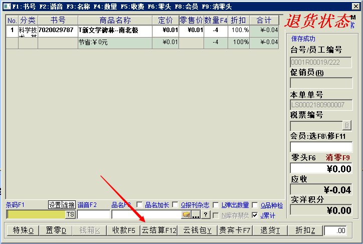 进入ERP零售退款界面,按正常POS退款流程,找到需要退款的零售小票。 按F12快捷键或鼠标点击“云结算”按钮 提示顾客在手机上打开扣款记录(点击微信、支付宝付款通知) 将商户单号扫码到收银机上 资金原路返回文档更新时间: 2019-03-08 13:34 作者:张国伟