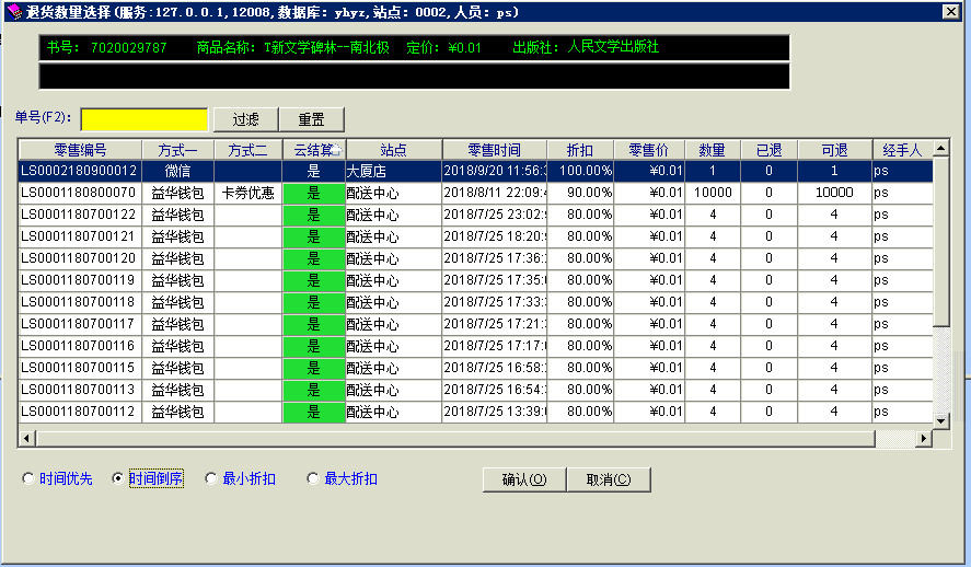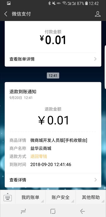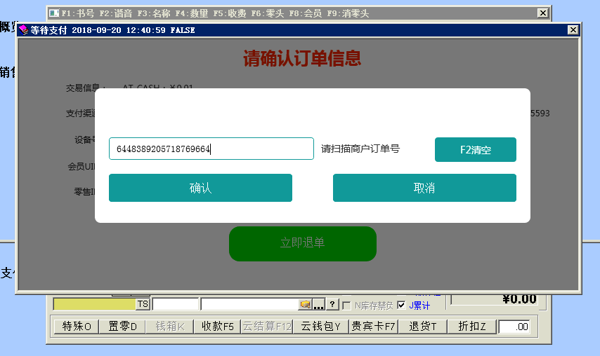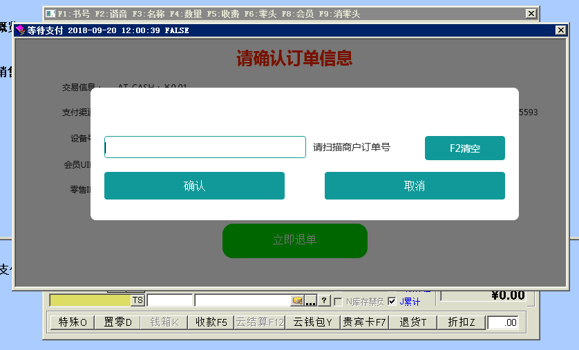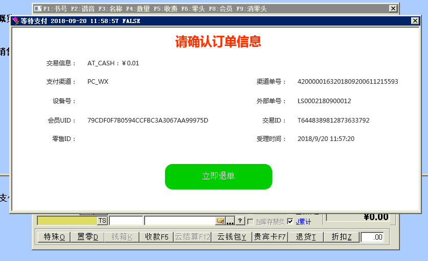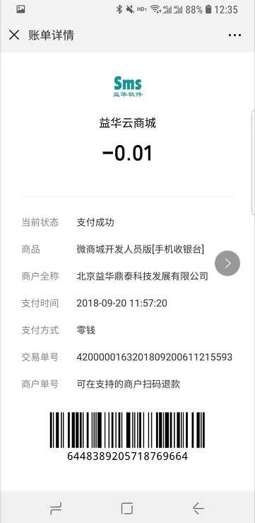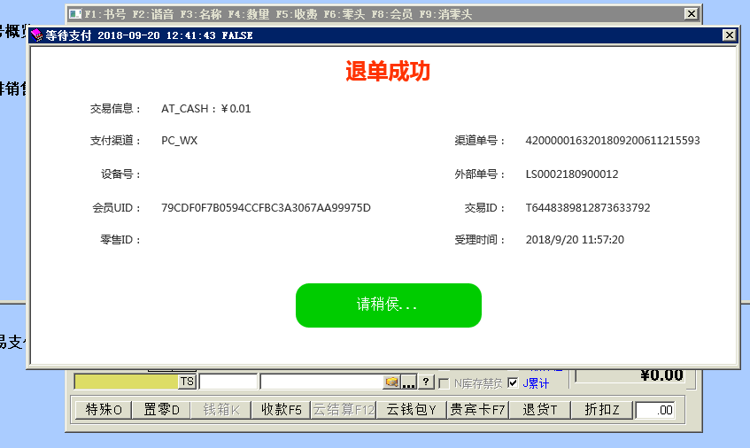 目录 搜索 益华云开放平台升级日志接入指南全局标准输出格式商家配置教程公众号配置教程1、创建顾客入口菜单2、设置公众号域名3、设置公众号IP白名单4、上传公众号配置云用户&云结算API文档(开发专用)修改记录基础接口组用户接口组会员登录会员登录(使用密码)会员登录(使用二维码)发起扫码授权登录获取扫码授权登录结果会员注册获取任意会员AccessToken登录后台系统账户接口组获取会员钱包信息调整钱包余额(平台级)获取钱包明细(用户级)积分接口组获取会员线上积分卡券接口组获取会员卡券列表(用户级)获取会员卡券列表(平台级)卡券可用性查询典型场景云结算接入益华云结算接入指南认证相关获取PlatformAccessToken付款接入创建预付款单据获取会员UID获取游客UID打开支付入口获取支付结果获取支付结果(带渠道和优惠信息)退款接入创建预退款单据打开退款入口获取退款结果数据复核获取获取云结算交易列表账户充值创建预充值单据执行充值通用数据结构账户类型对照支付渠道云结算配置配置向导配置云结算微信退款授权公众号异主体进账配置零售POS操作手册使用前设置POS收款卡券核销POS退款组合收款云结算复核本地交易复核渠道交易复核手机收银台操作手册收银员身份绑定运营设置退款授权推荐关注公众号微信支付联合运营云商城产品介绍API文档(开发专用)基础接口组获取站点公共配置交易接口组获取ERP零售交易列表获取ERP交易明细订单价格计算创建订单获取订单列表商品接口组根据条码、名称查询商品根据 GoodsID 查询商品更新商品库存获取ERP商品信息获取ERP库存信息批量获取会员价类目接口组获取商家自定义类目物流接口组店铺接口组获取站点列表获取站点详情评价接口组用户接口组租借接口组获取借阅卡列表获取借阅记录(用户级)ERP接口组向ERP写入订单获取ERP级别信息设备接口组获取设备信息通用数据结构购买类订单数据结构SellerCategory 商家自定义类目Goods 商品基本信息Device 设备信息ERP商品信息订单来源说明TradeType订单类型订单状态云物流产品介绍API文档(开发专用)数据接口组通用数据传输云梯产品介绍插件使用益华ERP中金ERP云备份商家后台管理系统系统设置权限管理角色维护角色授权用户授权门店管理新增门店商品类目管理商品管理商品上新教程设置上新站点和库房商品标记设置商品上新参数卡券管理卡券创建折扣券代金券礼品券通用属性说明卡券投放卡券核销卡券兑换营销活动管理功能简介录入营销活动参与营销活动营销活动管理会员体系设置通用会员级别借阅会员级别云钱包管理办理充值支付对账点餐模式设置设置门店座位布局设置点餐商品分类微信消息推送设置云采购文轩采购对接(ERP集成)用户标签标签分组管理用户标签管理标签使用场景微商城访问统计店中店分销模式代理商分润计算常见问题处理为什么商城中没有显示商品?益华云营销策略大全益华云电子卡券大全通用数据结构通用查询条件 暂无相关搜索结果! 本文档使用 MinDoc 发布 POS退款 进入ERP零售退款界面,按正常POS退款流程,找到需要退款的零售小票。 按F12快捷键或鼠标点击“云结算”按钮 提示顾客在手机上打开扣款记录(点击微信、支付宝付款通知) 将商户单号扫码到收银机上 资金原路返回文档更新时间: 2019-03-08 13:34 作者:张国伟
