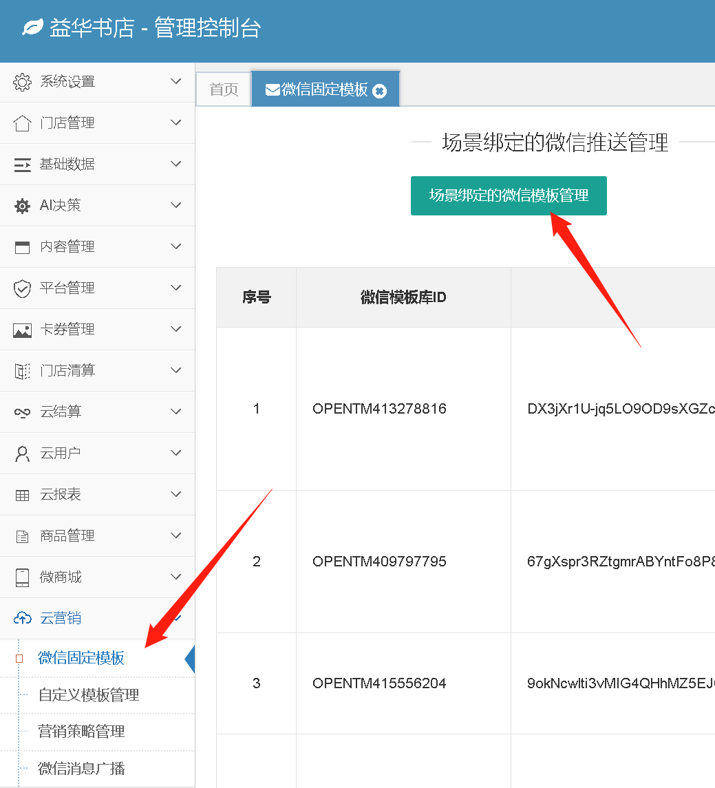 进去“云营销”,“微信固定模板”,“场景绑定的微信模板管理”,“新增模板”