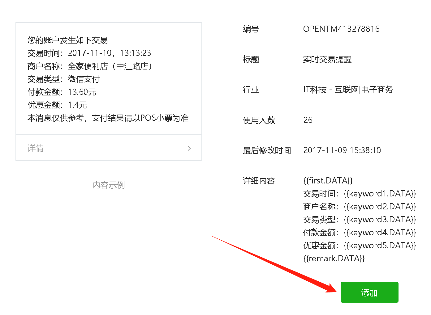 1、在益华商家后台,找到需要添加的模板,在公众号中加入