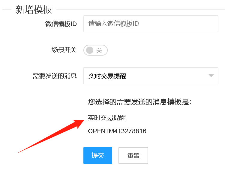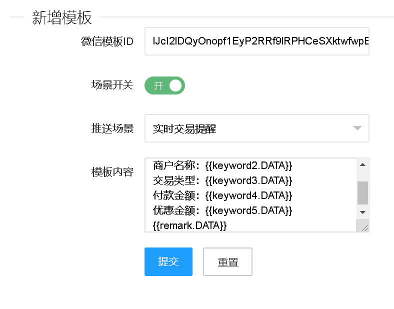 四、将公众号模板ID、详细内容,填入到商家后台,提交后即可开启微信消息通知