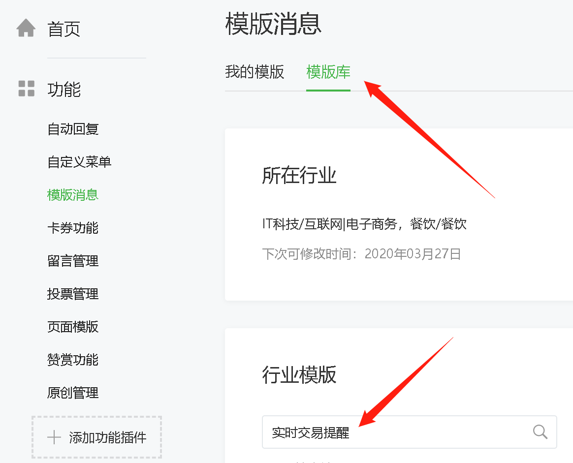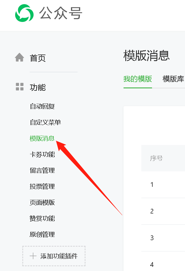 如果没有这个菜单,则先点击下方的“添加功能插件”,再点击“模板消息”,然后点击“开通”即可。