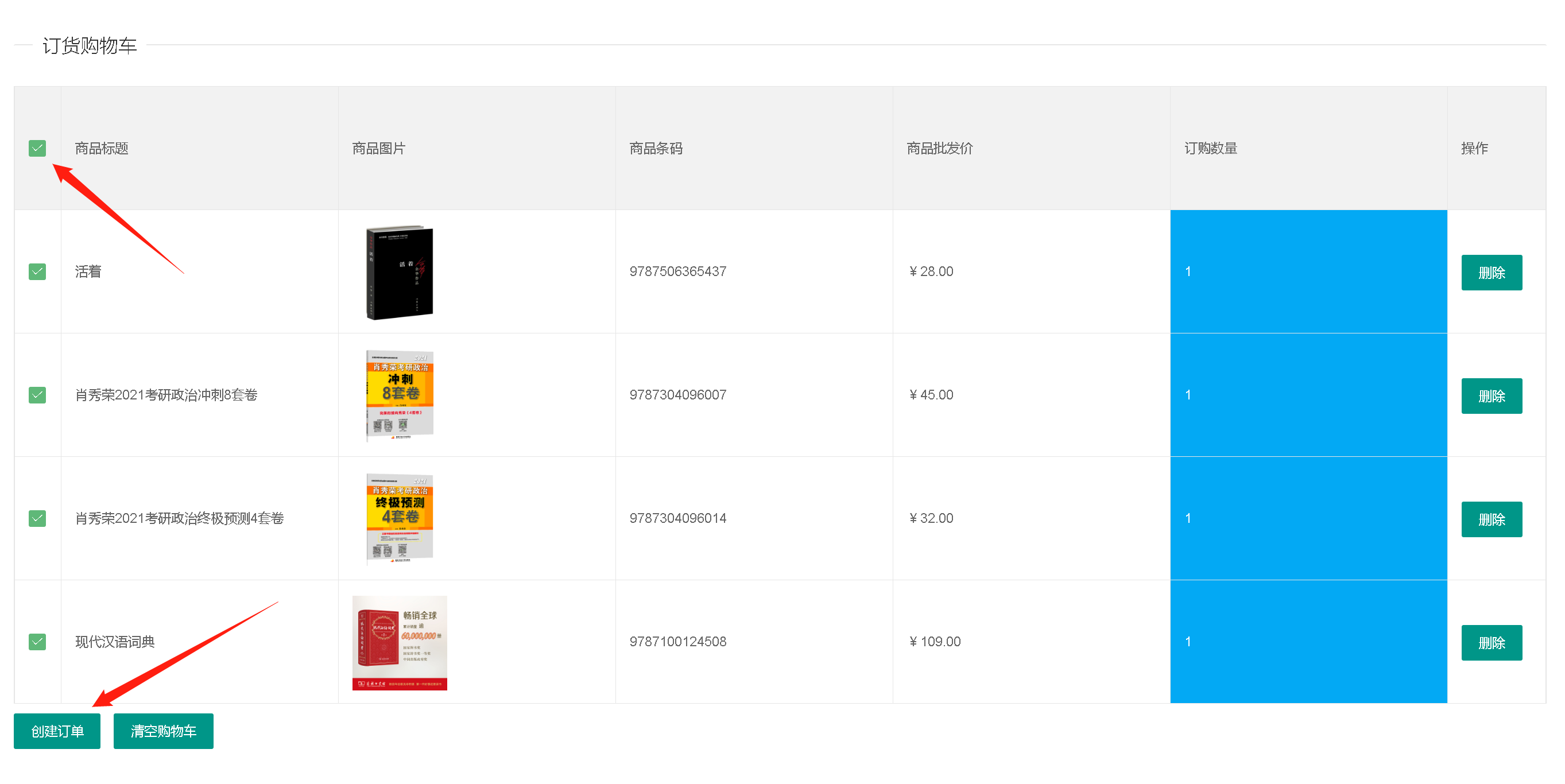 勾选全部商品,创建订单