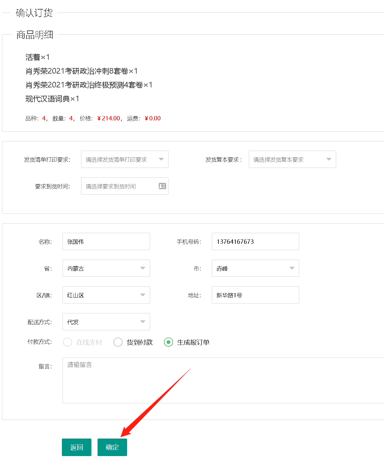 填写发货要求,提交订单