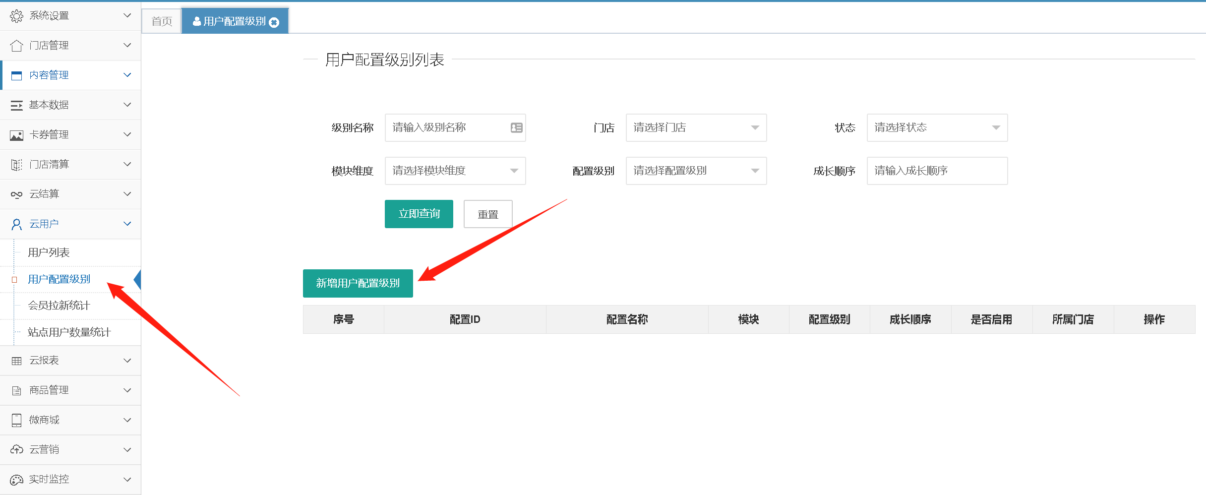 1、进入CMS客控管理系统,云用户,用户级别配置,点击新增