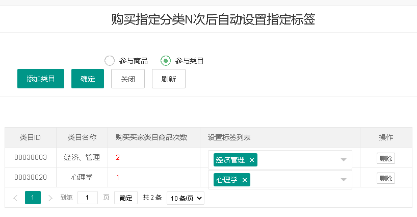 购买“经济、管理”分类商品 2 次,自动为购买人添加“经济管理”标签;